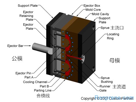 對于臥式注塑機來說,臺灣日本的一般叫公模和母模,香港的一般叫前模和后模,國內還有叫動模和定模的,也就是:公模=后模=動模,母模=前模=定模。